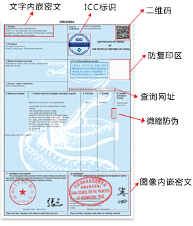 二 维 码 :包含数字证书信息,移动终端随时随地查询 防复印区:加密的防伪打印技术,保证单据真实性 查询网址:海外查询官网为海外进口商提供CO线上查询功能 ICC 标识:国际商会权威机构认可单据 文字内嵌密文:运用专业工具或软件,查看文字中内嵌的加密信息 图像内嵌密文:运用专业工具或软件,查看图像中内嵌的加密信息
